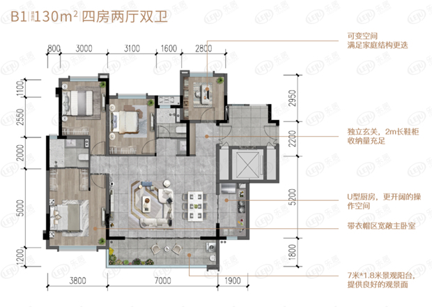特别是约7米大面宽的一体化餐客厅+约7米的阳台,利用率高,后期可改造空间较大,作为主力产品也基本售完,本期看看这种热销户型到底好在哪里。