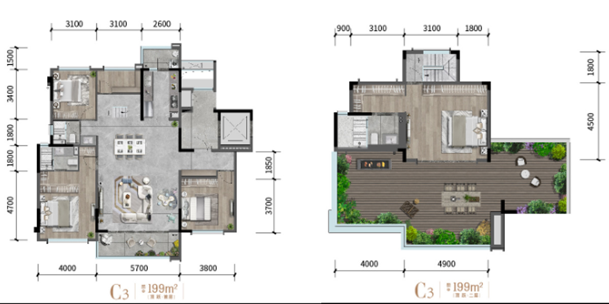 在空间上,基本格局接近,但直接超越之处就在于跃层的主卧私密套间加上顶跃的露台配置,在成都阳光稀缺的条件下更难能可贵。