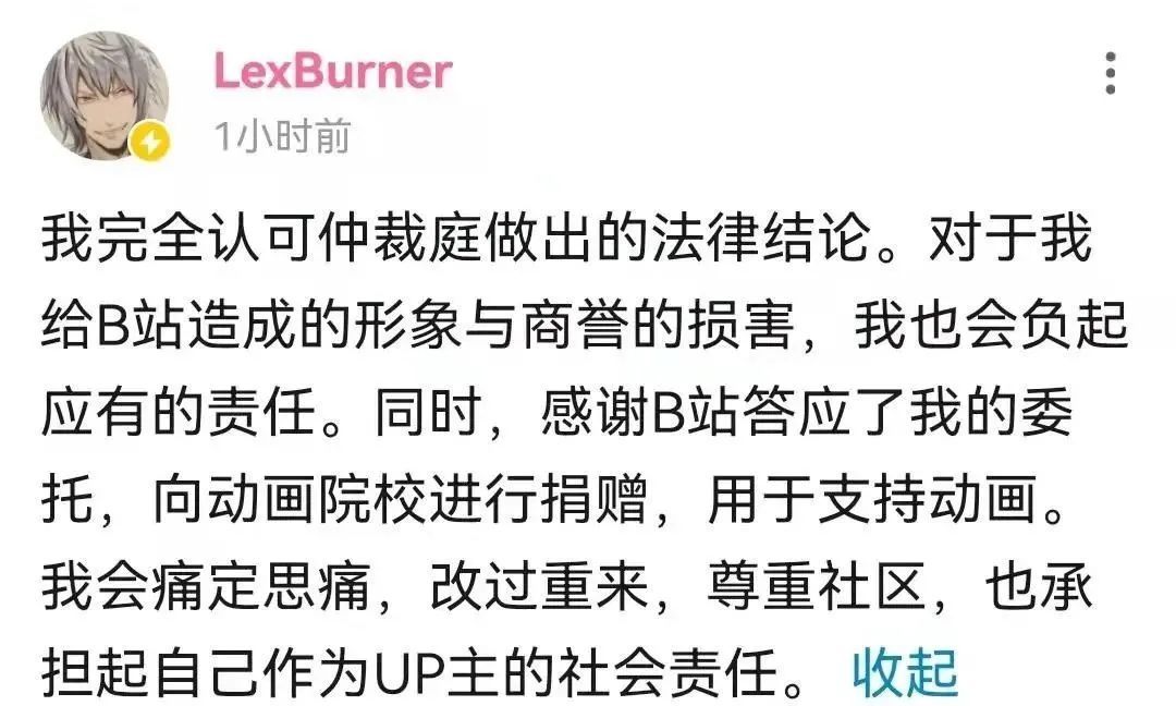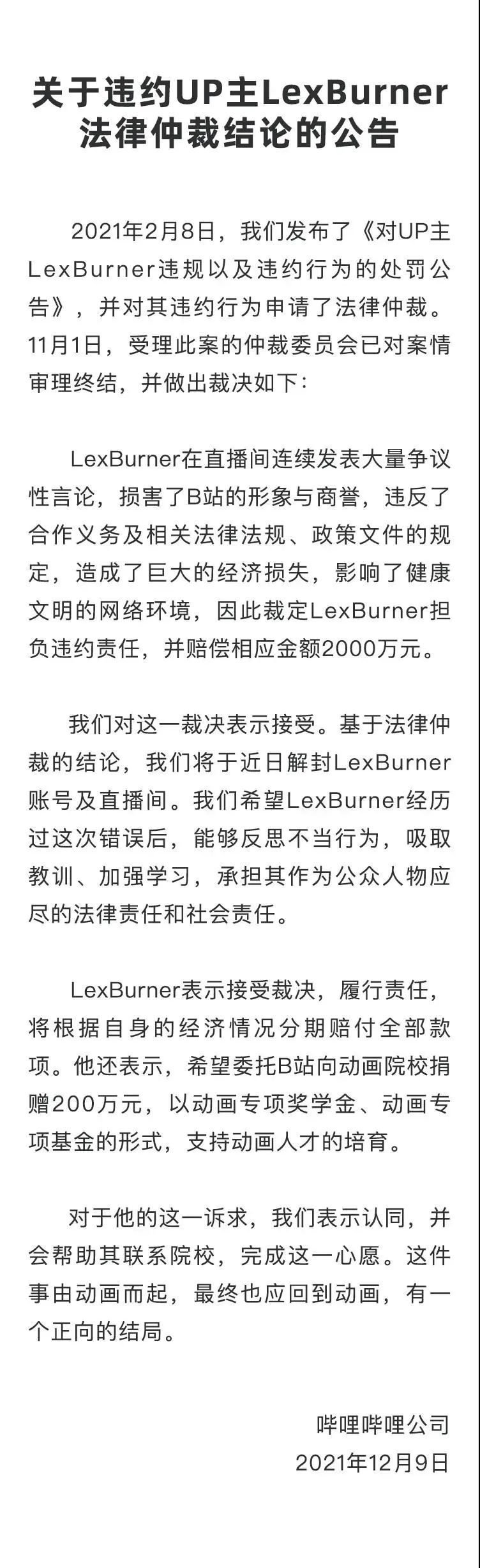 12月9日,B站发布通告:Lex赔偿B站2000万!解封LexBurner 的账号及直播间。