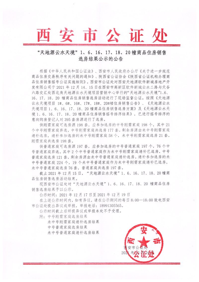 乐居买房讯 12月16日,西安市公证处发布《“天地源云水天境”1、6、16、17、18、20幢商品住房销售选房结果公示的公告》。