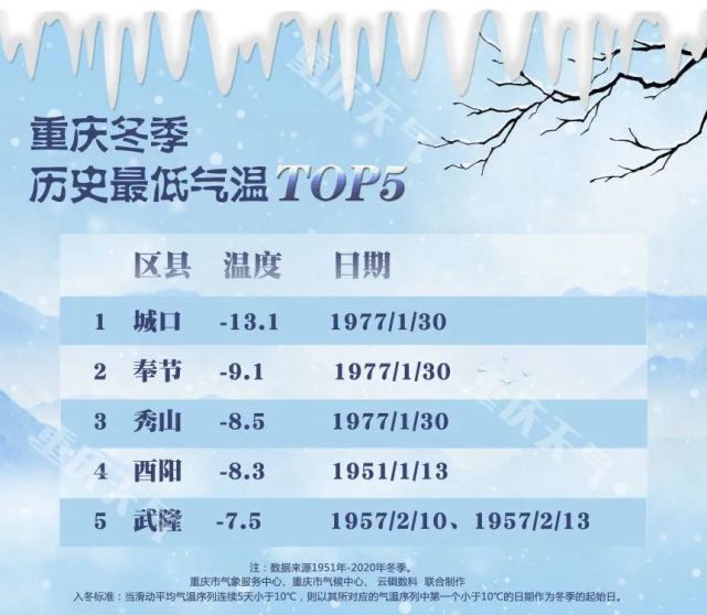 有气象记录以来,重庆历史最低气温出现在城口,1977年1月30日当地最低气温低至了-13.1℃。奉节、秀山、酉阳、武隆均出现过极端低温。沙坪坝气象站历史最低气温为-1.7℃,出现在1955年1月11日。