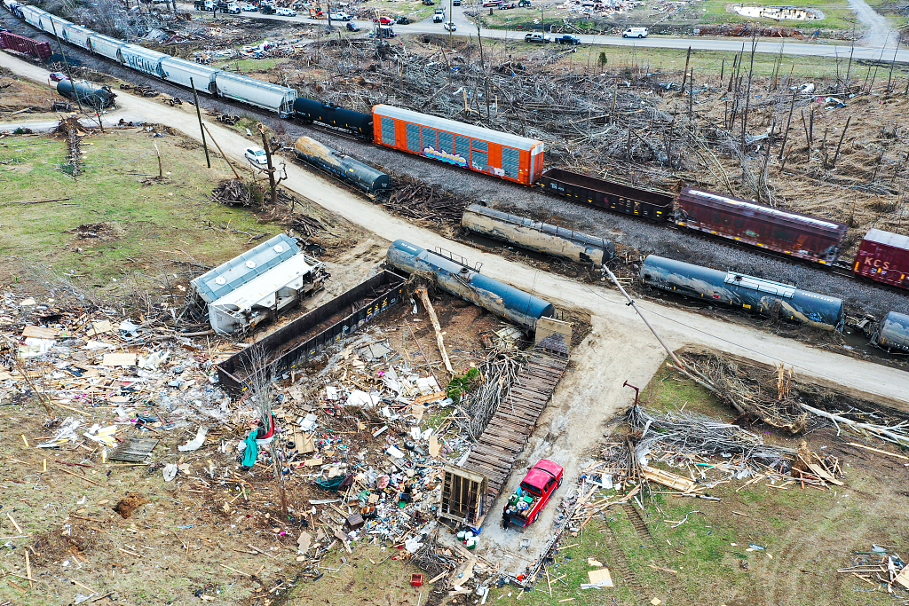 当地时间2021年12月15日,美国肯塔基州,龙卷风过境导致当地货运火车脱轨,房屋受损。