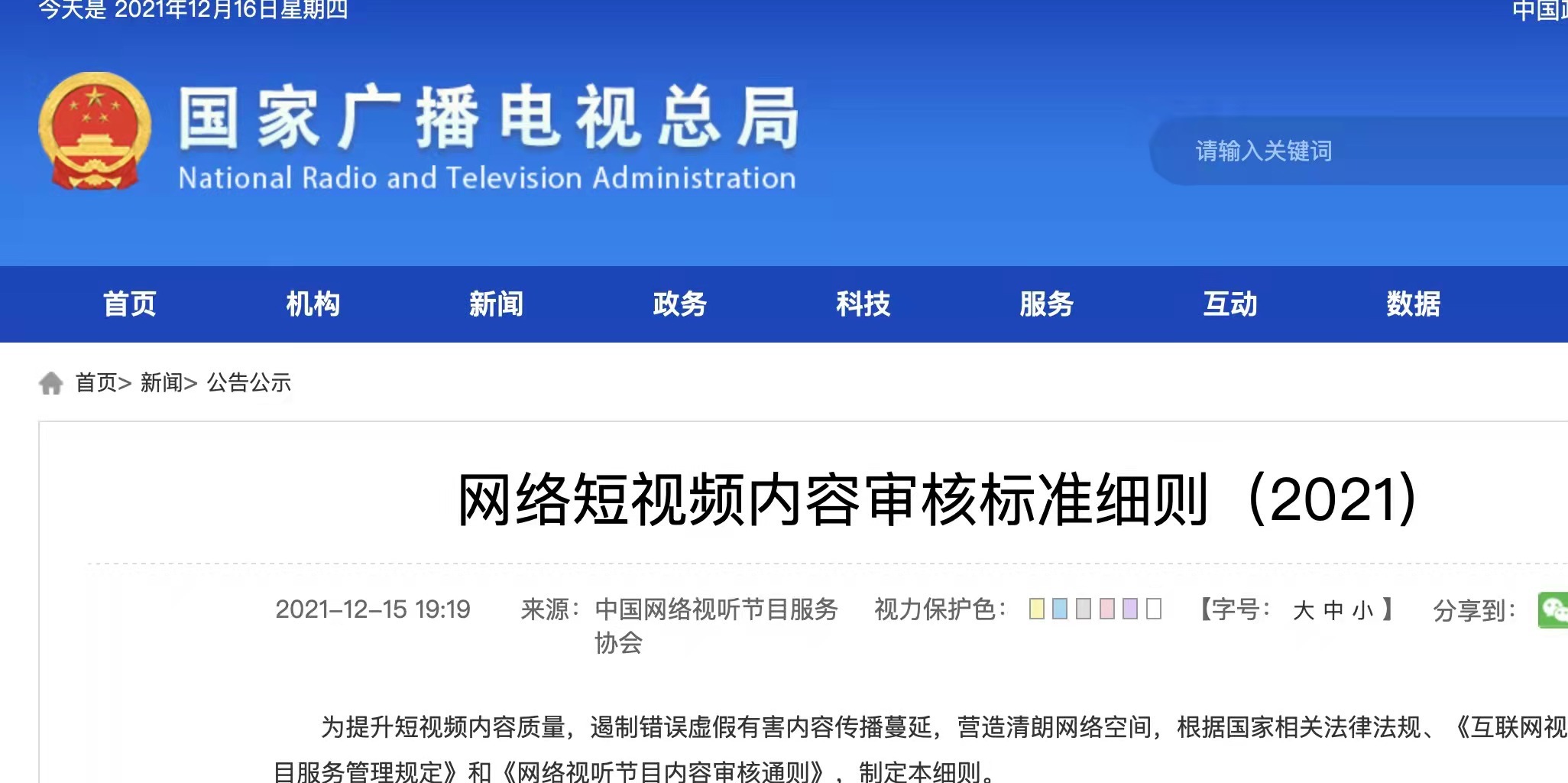 12月15日晚间,中国网络视听协会发布《网络短视频内容审核标准细则(2021)》(下称:细则),《细则》要求短视频节目及其标题、名称、评论、弹幕、表情包等,其语言、表演、字幕、画面、音乐、音效中不得出现危害中国特色社会主义制度、分裂国家、损害国家形象、泄露国家秘密、损害革命领袖和英雄烈士形象、破坏社会稳定等二十一大点一百小点的内容,其中第92条和93条关于对影视剧、电影的剪切、改编的规定引发行业关注。