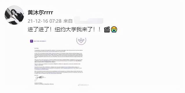 近日,知名主持人李静的女儿黄沐尔分享了一个好消息,她在社交平台上晒出了自己被纽约大学Tisch艺术学院录取的通知书,配文中用了多个感叹号来表达了自己的喜悦和激动之情。