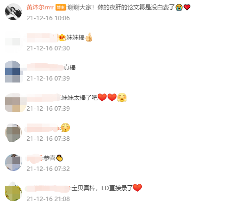 动态下面的评论区大家都纷纷表达了对她的祝福和夸赞,黄沐尔也对大家的祝福表示了感谢,并称自己熬夜肝的论文没有白费,由此看来黄沐尔真的是非常努力。
