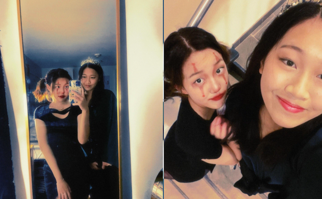 黄沐尔经常在社交平台上分享自己在美国上学的日常。前段时间万圣节的时候,黄沐尔在个人社交平台上发了与朋友的照片,她头发扎着双马尾,在脸上用红色颜料化了妆,妆面酷似小丑,可爱又俏皮。黄沐尔和朋友都穿了一身黑色紧身的连衣裙,头上都戴着皇冠,俩人酷劲十足。