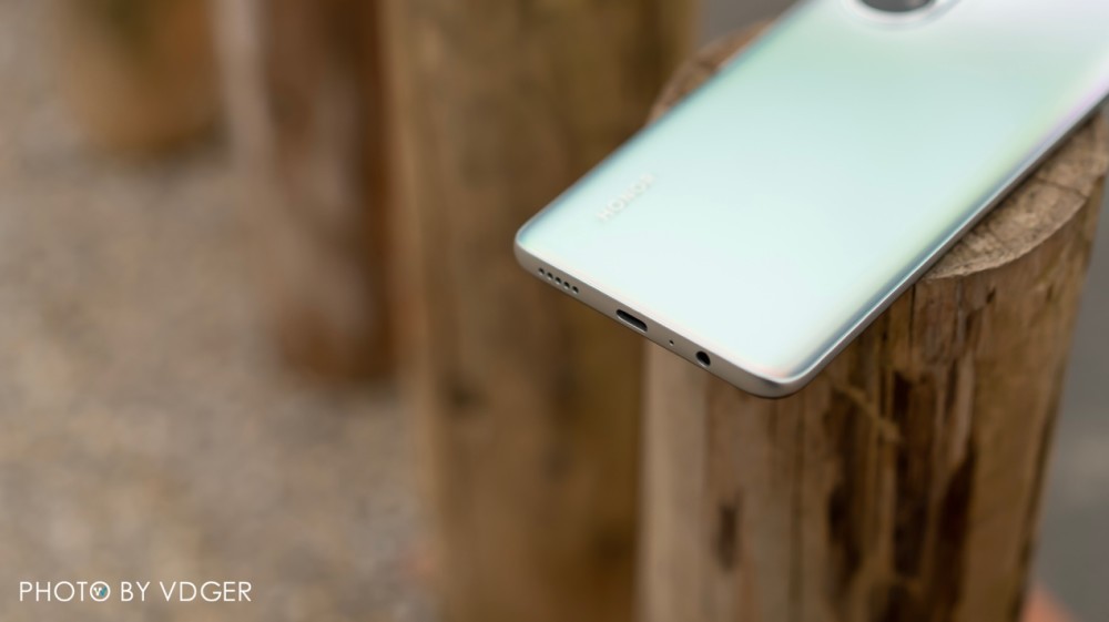 荣耀畅玩30 Plus并没有采用金属中框,底部除了USB Type-C接口外,还保留了“极为先进”的3.5mm的耳机接口,机身右侧荣耀畅玩30 Plus采用了一枚指纹电源二合一的按键,按键细长,键程偏软,但指纹识别的速度和识别率还算比较OK。