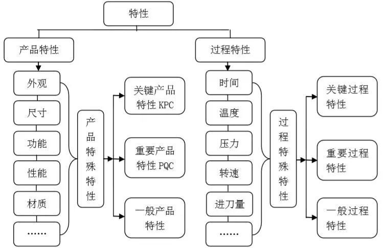 特殊特性是可能会影响到产品的功能、外观、性能、法规符合性、安全性、装 配或配合的特性,可以分为产品特性和过程特性,具体细分如下图: