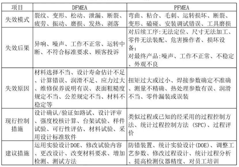 在FMEA表格,经常混淆表格中的描述方式的概念。例如在问题描述时,经常失效模式、失效原因、失效后果的概念模糊,现行措施与建议措施模,而且DFMEA表格和PFMEA表格的填法也不尽相同,具体区别如下表: