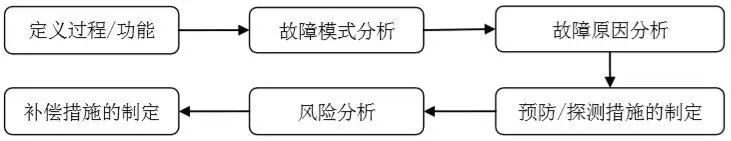 DFMEA和PFMEA的实施流程基本一致,都是先定义过程/功能、故障模式分析、故障原因分析、预防/探测措施的制定、风险风险,最后到制定补偿措施,具体如下图: