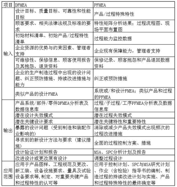 FMEA应用到产品设计、过程设计和问题解决等阶段。FMEA分析信息收集越充分,输入信息越多,那么FMEA分析的有效性越强,输出就越全面,应用效果越好。DFMEA和PFMEA的输入输出的不同点,如下表: