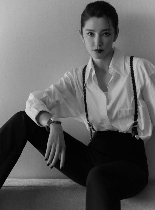 她也可以是帅气的,头发全部拢起显得干练,身上穿着白色衬衫搭配黑色背带裤,显得简约而又大气。