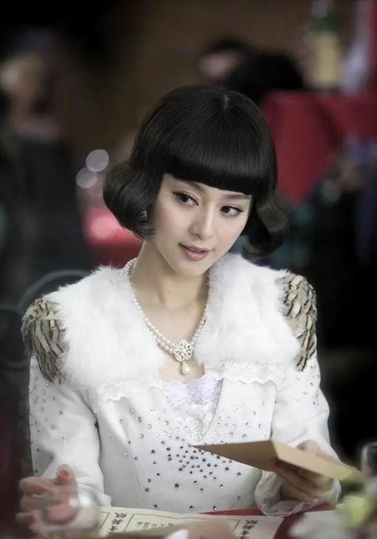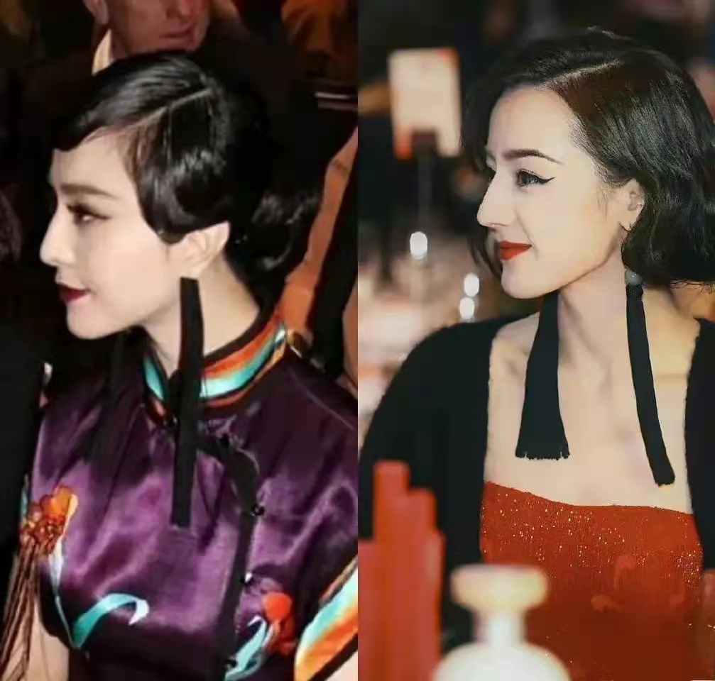 之前迪丽热巴被吹到爆的红毯造型,利落的短发到发梢微卷、眉上的刘海,脖子上的珍珠项链都和范冰冰在《金大班》中相似。
