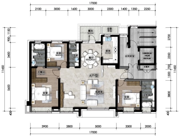 四间卧室分布于房间角落,与客厅形成动静分区,互不打扰,生活与起居区动静分离,减少活动噪音,并确保了生活私密性。同时也减少了面积浪费,提高利用率。南向主卧带270°转角飘窗设计,观景效果更佳,在保证室内采光的同时,又进一步扩充了室内空间感。