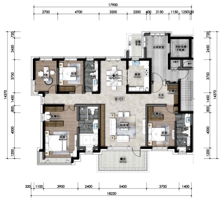 该户型五面宽朝南,从独立玄关设计入户,即到整体开间约18.2米,约5.4米的客厅开间,视野开阔,居者可以享受充沛的日照。宽进深约2.5米的超大阳台露台,使室内光线充足,极大提高了居住舒适度,且实用性较高,阳台设置了上下水,可洗衣晾晒衣物,也可做为休闲区域满足平日的休闲阅读,养花品茶,瑜伽等。