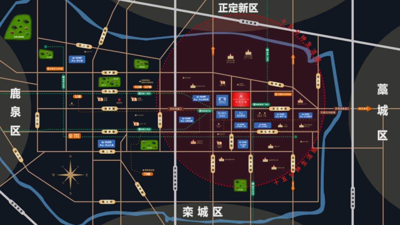 该地块周边云集了众多高品质楼盘,如天山公园北侧的正基九宸,北侧的瀚林甲第、富力城等,顺着南二环东延线上有万科新都会、东创铂悦府、保利时光印象、石家庄华远海蓝和光新盘等。世界壹號紧邻天山海世界,交通便捷,人性化的户型设计和规划使得项目颇受购房者欢迎。