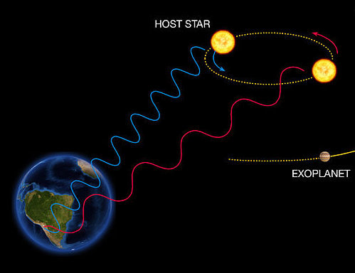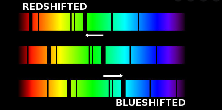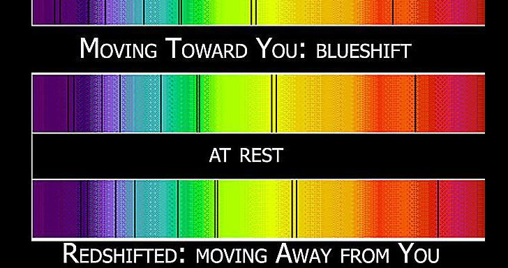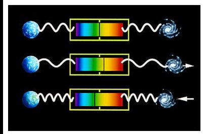 光也会有同样的多普勒效应。当物体朝我们移动时,波长会发生变化,向光谱的蓝色一端移动。当物体从我们身边移开的时候,光被“拉伸”向红色,我们可以观察光谱线中的移位现象。