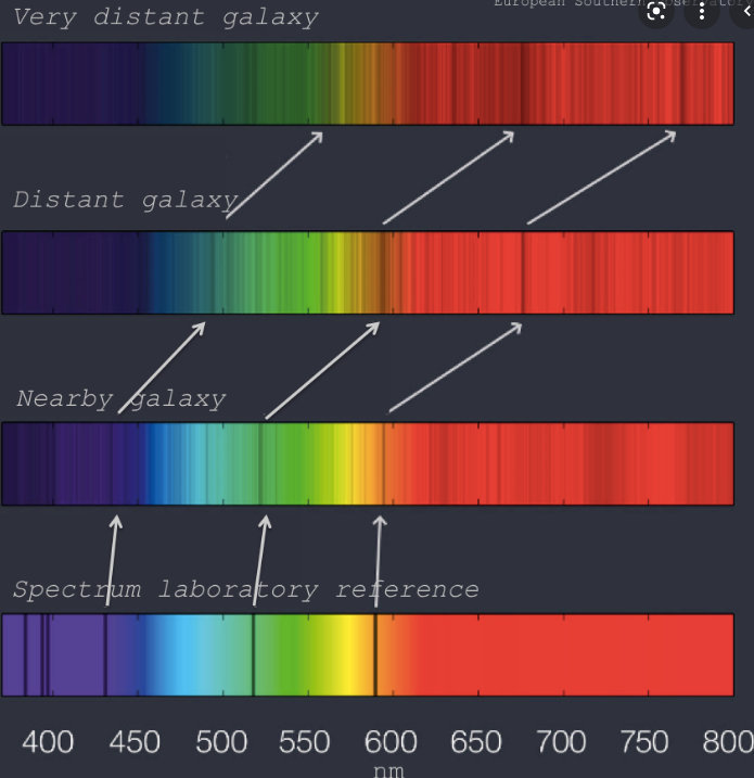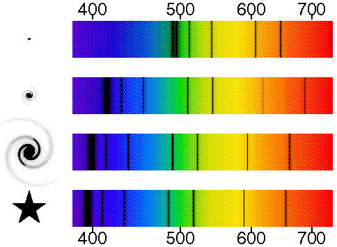 在上面的图表中,你可以看见两个光。一个来在太阳(一个已知的每个吸收线都确定的光谱),一个是来自遥远星系的超级星团。当我们比较这两个星系的时候,我们看到太阳的氢线和遥远星系的相关、有联系。唯一的区别是星系中的吸收谱线都向上移动(朝向红色)。这就指向了红移,可以得出一个结论:这个星系正在远离我们,或是说我们正在远离这个星系。