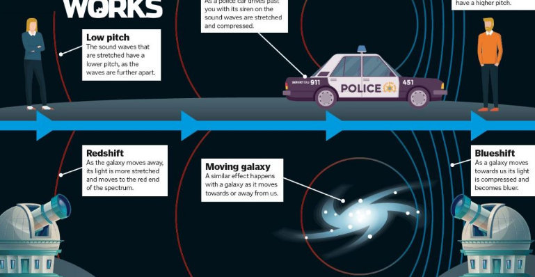 红移和蓝移都是多普勒效应的可观测现象。过去你很可能曾亲眼目睹过多普勒效应。最好的例子就是警车高速驶过时的警笛声:当警车向你驶来的时候,警笛的音调会变高,比警车远离你时的音调要高。这个现象与声音频率的提高有关。这在下列的视频中进行了展示。