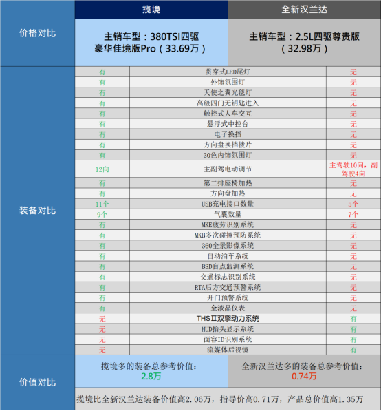 总结,汉兰达作为一款经典车型,到如今经典仅成了它的外衣,内置的配置却当不起经典之称,有些金玉其外败絮其中的感觉,无论是外观内饰配置,还是智能驾驶配置、舒适性配置等等都不如揽境甚多,性价比确实是揽境更高,各位车友想买车的,还是考虑主销即旗舰的TALAGON揽境为佳。