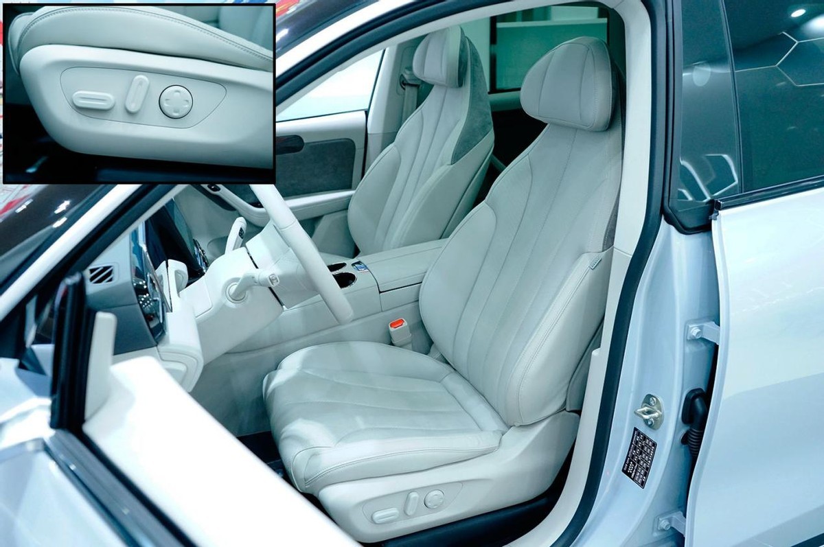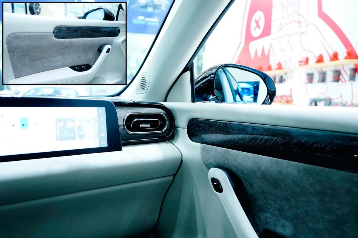 车厢用料比较厚道,椭圆形空调出风口附近是仿木纹饰板,门板上的木纹饰板中还巧妙地融入了多色氛围灯,扶手处采用皮质覆盖、还加入了麂皮绒点缀,无论触感还是视觉上都不乏档次感。