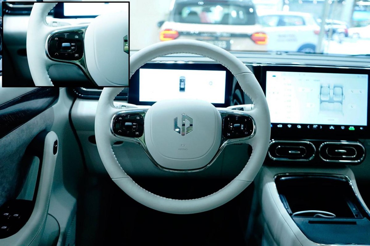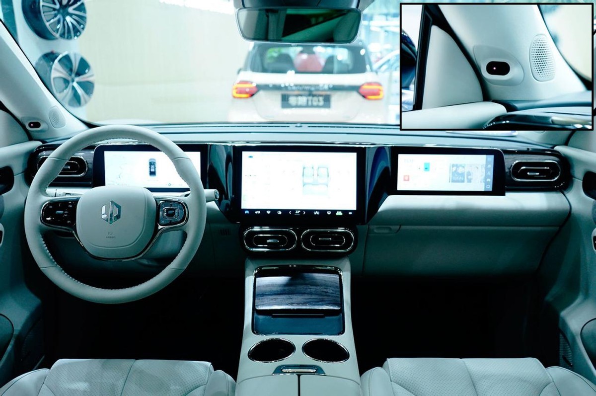 车厢的布局挺有意思,方圆结合的布局很符合中式文化特色,三块屏幕方方正正,而椭圆形出风口、圆形杯架和方向盘又有大量圆形元素,组合在一起还算协调。10.25英寸全液晶仪表盘、12.8英寸中控屏和10.25英寸副驾专用屏让车厢的数字化程度很高,而且中控屏与两侧屏幕并不在同一水平面,凸出式布置便于触控。左侧A柱设有人脸识别摄像头,不仅起到监控作用,更可以身份识别进而提供个性化设置。