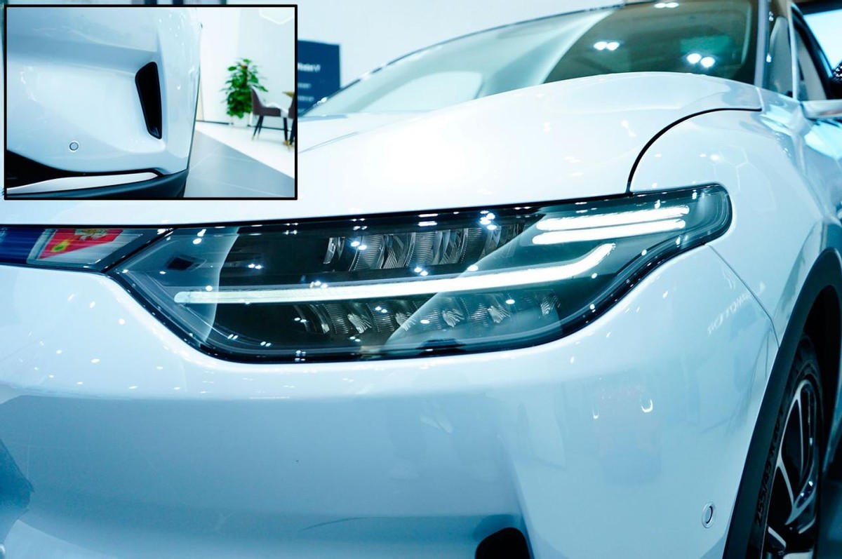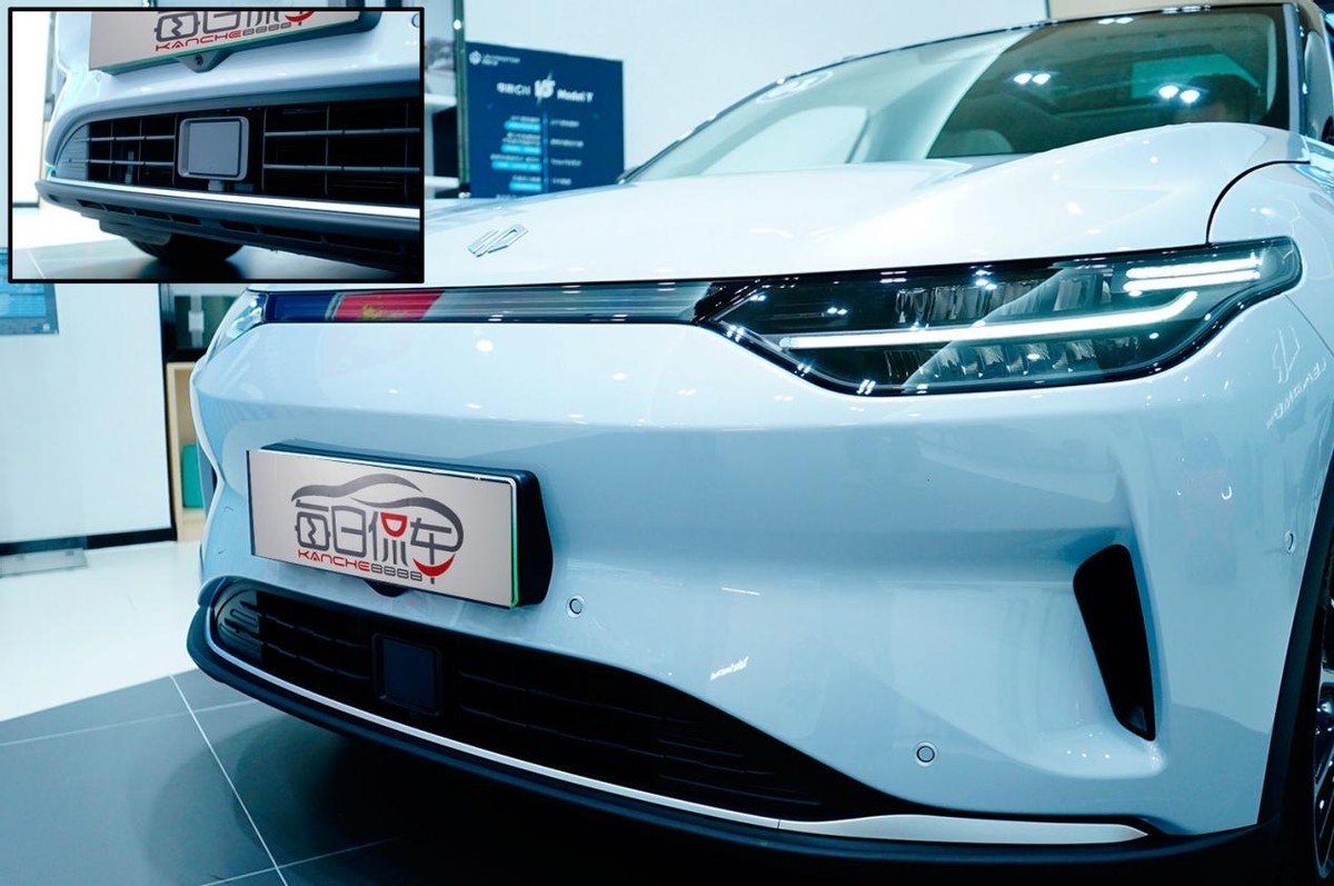 采用了电动车常见的封闭式前脸,但造型很有设计感。前机盖与头灯位于同一曲面,显得下压感很强烈,车头曲面分界线位于牌照框上方,下方采用内凹造型,便于把正面气流引导至两侧导风口向排出,能够降低风阻。顶部头被贯穿式饰条连接,很像是贯穿式日行灯,但中间其实并不能点亮。牌照框底部集成了前置摄像头,下格栅中央集成毫米波雷达,底部有立体的前唇并增加了银色饰条。