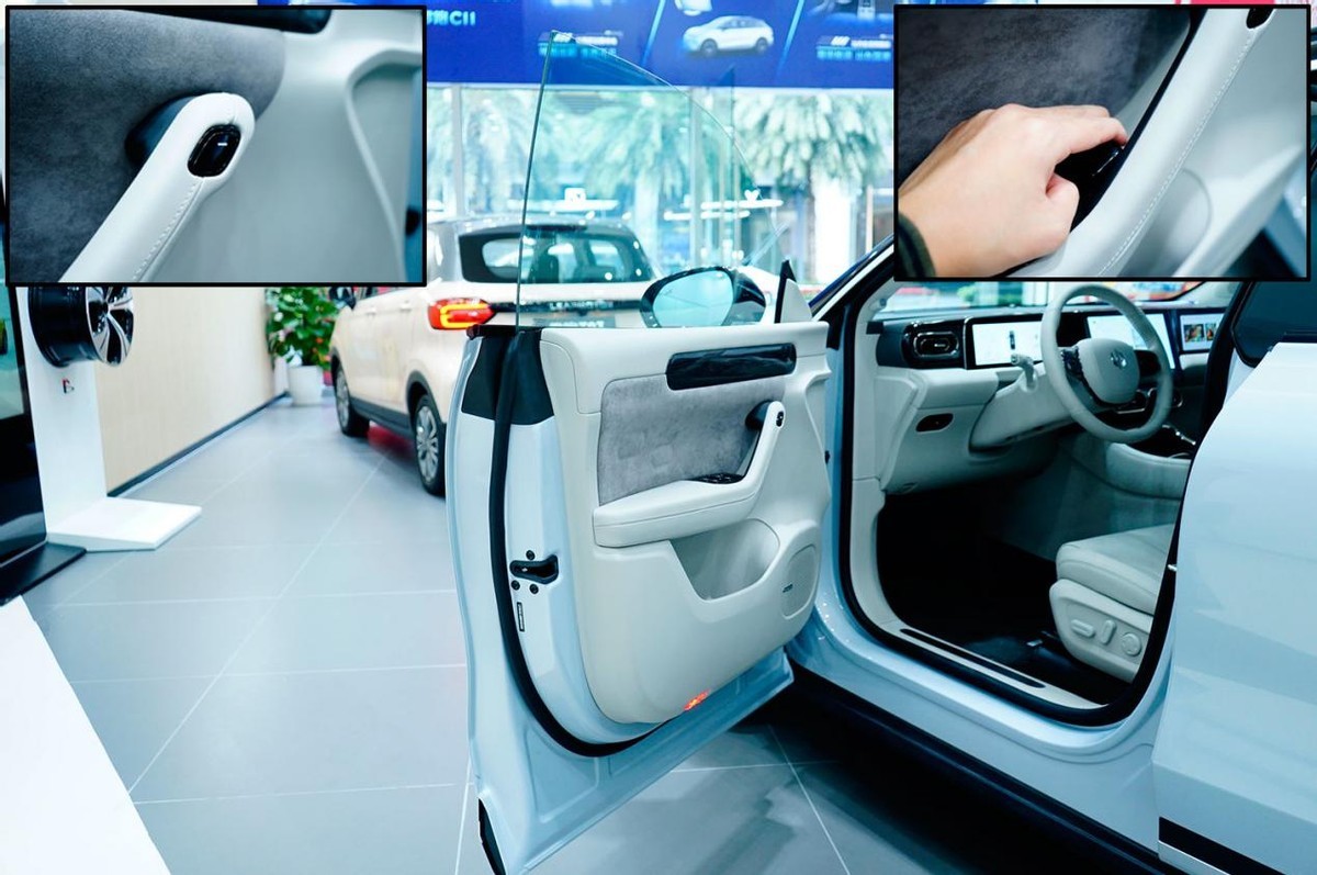 为了提升档次感,采用了无边框车门,打开车门显得很拉风,还采用双层玻璃降低噪音。车门采用电子按键解锁(左上图),但保留了机械解锁拉手(右上图),确保万无一失。