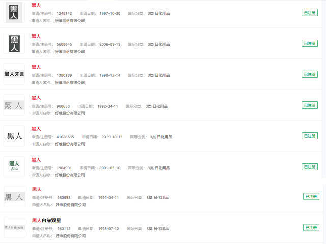 查询全国企业信用信息公示系统显示,黑人牙膏所属企业好来化工(中山)有限公司的企业类型为有限责任公司(港澳台法人独资),英文名为Hawley & Hazel Chemical Company (Zhongshan) Limited ,为好来亚洲投资有限公司(HAWLEY AND HAZEL ASIA INVESTMENT COMPANY LIMITED)100%控股企业,两家旗下均无任何商标信息。后查询“黑人”、“DARLIE”商标的所有人竟然是好维股份有限公司,英文名为HAWLEY AND HAZEL(BVI)COMPANY LIMITED)。根据官方资料显示,1985年5月15日,好维公司在英属维尔京群岛注册成为国际业务公司。自1989年开始,好维公司在中国陆续注册了“黑人”、“DARLIE”及图形等系列商标,核定使用商品分别为国际分类第3类“牙膏、牙刷”等、第21类“牙签、清扫用具”等、第30类“洗涤剂、清洁制剂”等商品。