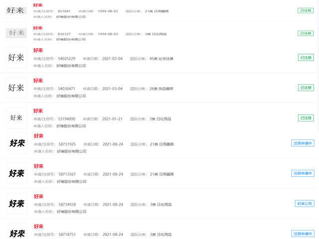 “好来”作为好来集团替换“黑人牙膏”启用的新品牌,大多数人会依据常识和经验来猜测——“好来”应是一个新注册的商标,答案是错的。“黑人”、“DARLIE”及图形等系列商标持有人多维股份有限公司于1994年8月13日就申请了“好来”商标,申请类别分别为国际商标第3类(日化用品)与第21类(日用器具),后于2021年陆续申请了国际商标分类1-45类的大部分类别的商标,目前大多数状态显示为“已注册”、“初审公告”,少数类别“注册申请”中。