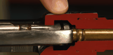 这些动作里面,击发之前就是装填、闭锁。装填好理解,就是将子弹装进枪膛里,放到位置。那闭锁是啥?简单说闭锁就是将弹壳尾部固定死了,通过锁定枪机,将子弹封在枪膛里面。这样,你才能把子弹正常地打出去。如果不闭锁,弹壳尾部并没固定死了,子弹击发的时候,弹壳顶着枪机就向后飞出去了,这是初中物理知识了。所谓闭锁,就是通过一个结构,顶住枪机、关闭枪膛,避免弹壳在击发的时候向后冲。