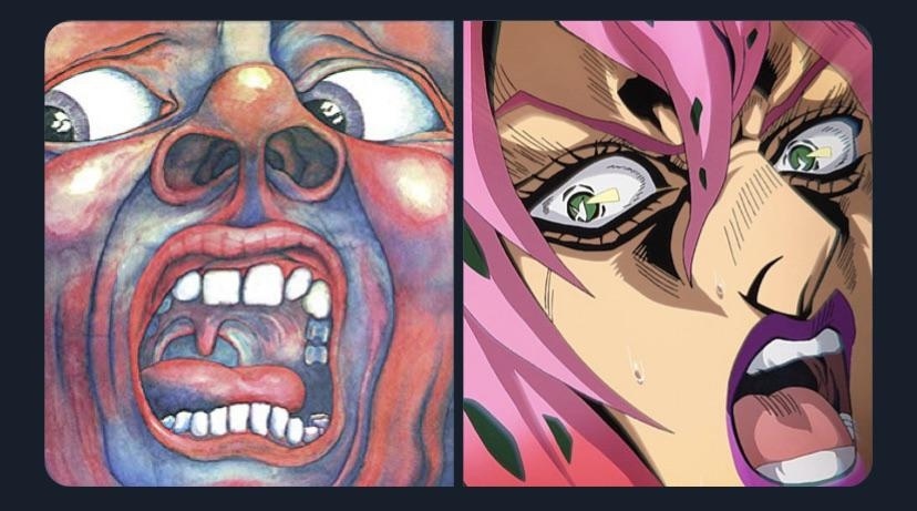 《黄金之风》的大 boss 迪亚波罗的替身「King Crimson 绯红之王」以及他的能力「Epitaph」我也是很喜欢的,因为对应的也是一个很经典的前卫摇滚乐队「克里姆森国王」——形象除外,因为真的太丑了,一种奔波霸的即视感。这些我就不详细讲了,都在播里了,希望大家喜欢。