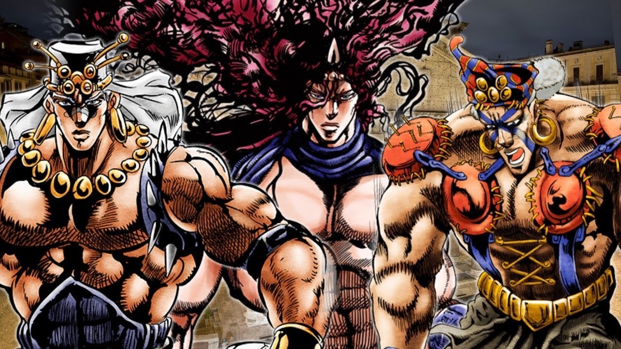 然后第二部就开始了另一条线——四个来自远古的超级人类「柱之男」,因为被封印在一条很巨大的柱子里而得名。这四个人是卡兹、艾斯迪斯、瓦欧姆,还有桑塔纳,分别对应着 The Cars、AC/DC、Wham! 和 Santana 四组殿堂级的乐队和音乐人。