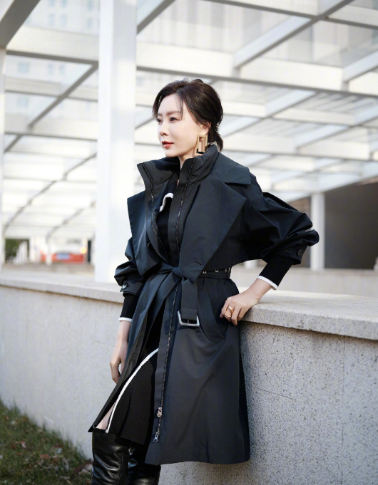 陈数的造型经常给人眼前一亮的感觉,不久前陈数参加某品牌活动时,风衣搭配长筒靴的造型也曾引起网友热议。从工作室的图来看,陈数一身黑的装扮酷炫十足,毛衣内搭上白色的围边和金色的首饰中和了一身黑带来的沉闷感,为整体增加了一丝金属感。