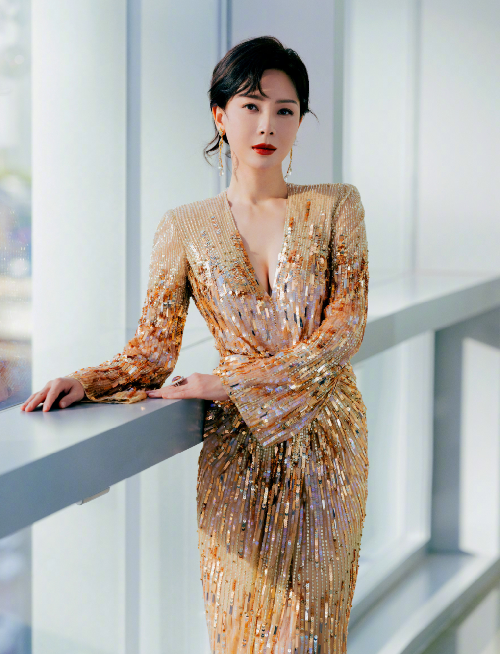 在她分享的照片中,陈数身穿着V领低胸紧身裙,衣服上的金色闪片在阳光的照射下,让陈数看起来闪闪发光,她微卷的头发盘在头发搭配着耳朵上的金色水晶吊坠耳环显得十分优雅,脸蛋上精致的妆容,特别是烈焰红唇和白皙的肌肤形成鲜明对比,更加女人味十足。