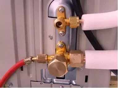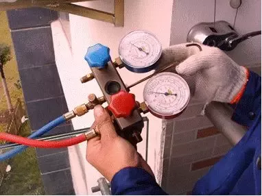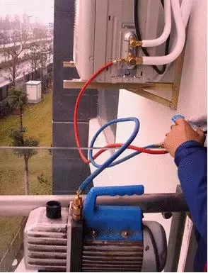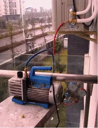 将压力表用蓝管和真空泵相连,外机的气管(粗管)三通阀修理口用红管接上压力表,检查各连接是否上紧。