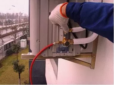 一般到了此步抽真空已经成功,会把真空泵和压力表都拿下来...有的情况比较特殊,工人把真空泵拿掉后,压力表还接在上面,液管气管阀门全部打开...在此状态下即开机测试...是测试下机器运行时的压力,达到15~20公斤即为正常...达到压力后,工人摘下压力表的瞬间我听到明显的喷气声,感觉到有气体从压力表和外机粗管三通阀接口的地方溢出,虽然溢出很少很短暂,可是声音明显...