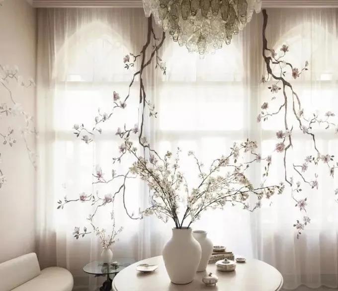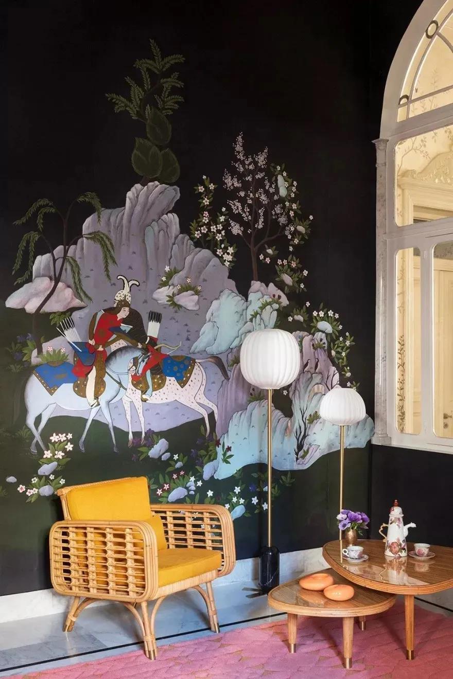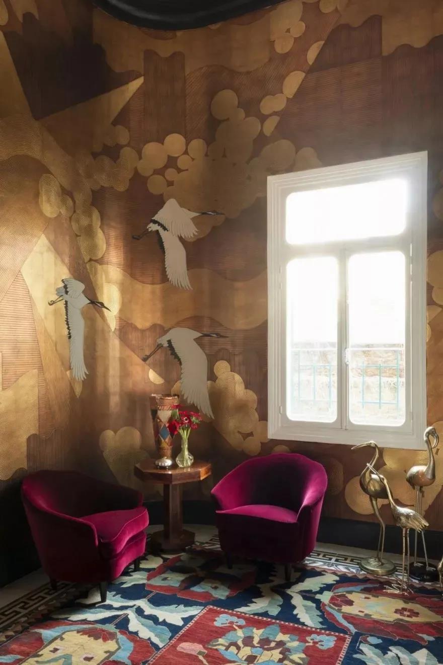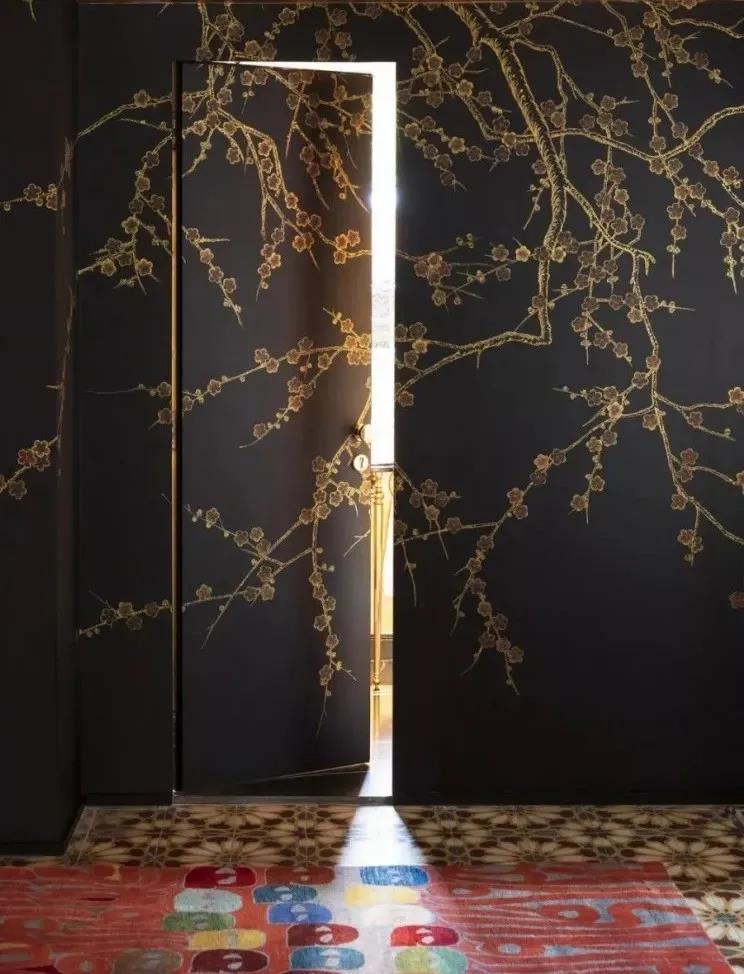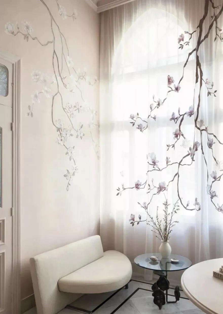 墙面多采用具有中国风情手绘效果,有木兰、仙鹤、梅花、牡丹这些典型的中国元素。再加上具有现代感的家具和法式浪漫的门窗效果,营造出一种神秘、浪漫、华丽的艺术氛围。