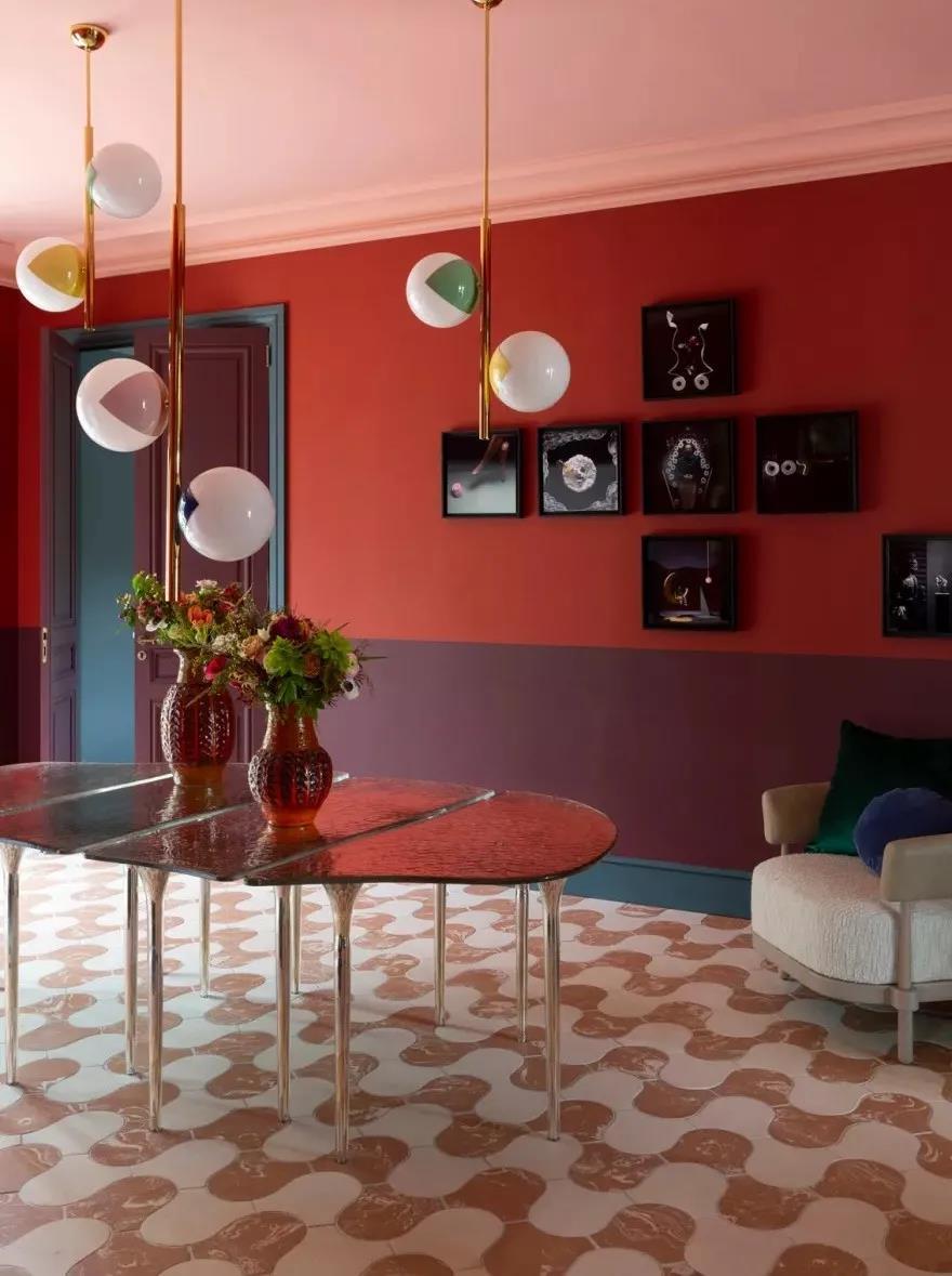 起居室以赤红色为主,与蓝白空间形成强烈的对比,再加上浪漫的波普纹路,赋予室内精致而奢华的质感。