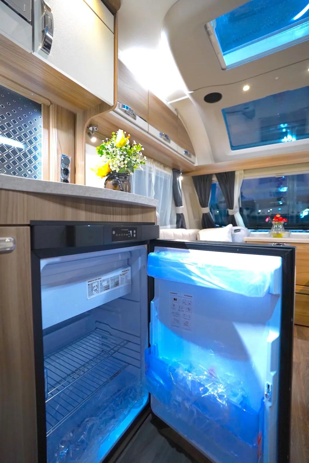 车身中部是厨房区,配备了微波炉、烤箱、洗菜池、独立水龙头、塞特福德集成灶等设施,满足日常烹饪所需;橱柜右侧设有折叠板,增加操作区使用面积;顶部配有储物吊柜,方便收纳厨房物品。
