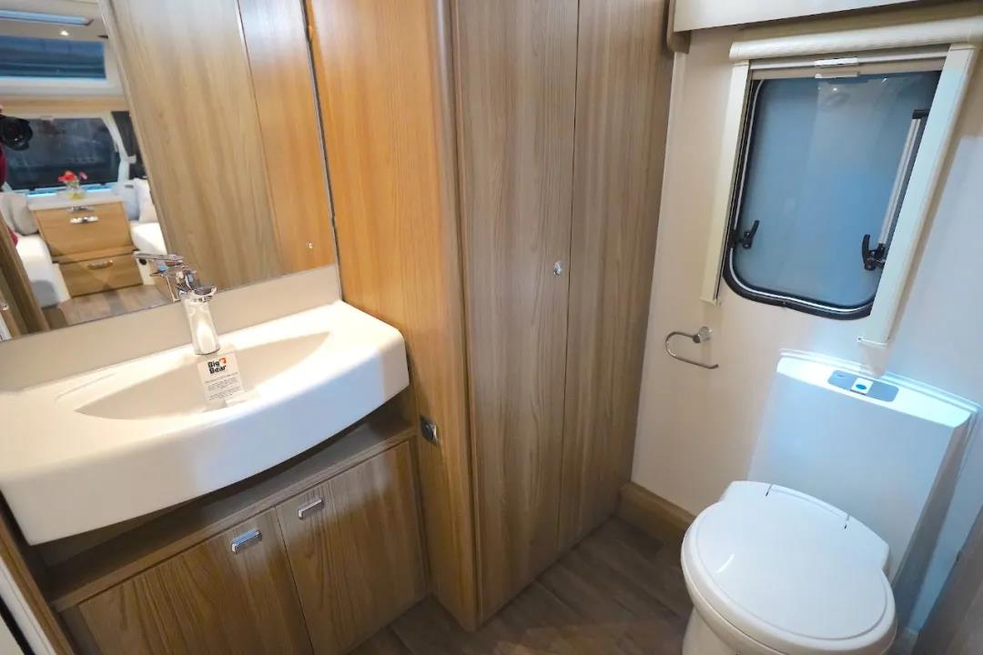 尾部卫浴区采用封闭式干湿分离设计,隐私性好,使用空间也非常充足;内部配备了卫浴柜(带独立水龙头、洗手盆)、赛特福德20L抽拉式马桶(带20L独立水箱)、特鲁马电器双用暖风热水系统、气电双能源模式热水器等设施,满足日常卫浴、盥洗需求;淋浴间紧邻卫浴柜,可独立使用。