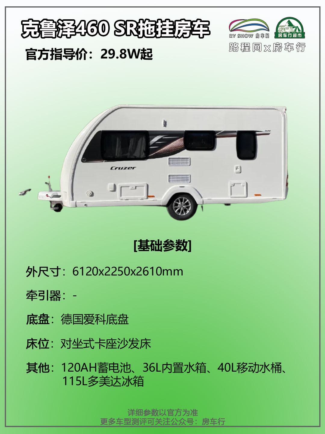 水电方面,克鲁泽460 SR房车配备了36L内置水箱、40L移动水桶、潜水泵、120AH蓄电池等,满足日常水电所需;此外,这款房车还可根据个人需求,选装10公斤煤气罐、太阳能板、空调、外置厨房灶等设施。价格方面,克鲁泽460 SR拖挂房车在国内的售价为29.8W。你觉得这款房车怎么样呢?欢迎评论区下方留言!(ps:参数/图片来源于克鲁泽房车官方)声明:文中价格、参数仅供参考因配置、版本不同部分数据或有变动具体请以官方为准图文编辑排版:墨 羽校审:夜如霰·END·