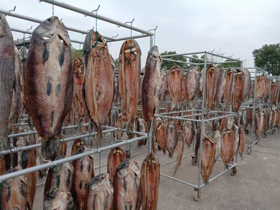 这段时间,随着冬季的来临,天气转冷,作为“中国青鱼之乡”的秀洲区王江泾镇青鱼捕捞、加工、销售开始进入旺季。12月14日上午,记者来到嘉兴市级农业龙头企业——诚兴水产养殖服务有限公司时看到,在晾晒场,晒鱼架上挂满了腌制好的青鱼干,油光发亮,空气中飘荡着的淡淡鱼干香味令人口舌生津。