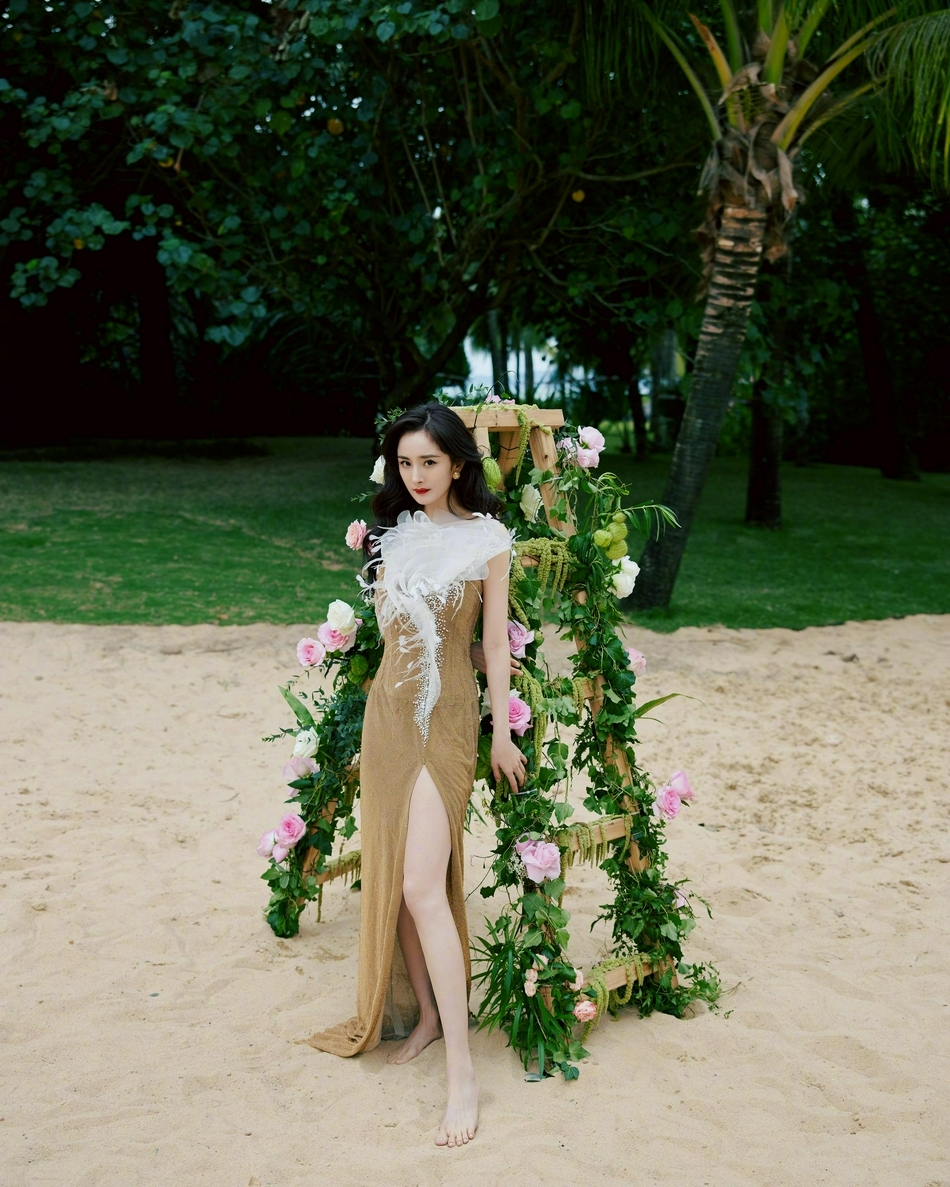 杨幂户外拍摄沙滩玫瑰大片 穿金色白纱开衩裙大秀美腿