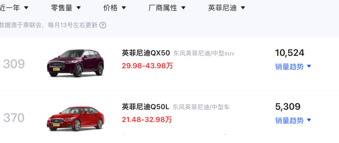 资料显示,东风英菲尼迪是英菲尼迪与东风汽车于2014年共同出资成立的合资品牌,今年是东风英菲尼迪成立的第六年了。在英菲尼迪实现国产化后,并没有像预期那样快速发展。截至目前,东风英菲尼迪仅有Q50L和QX50两款车型在售,产品更新节奏缓慢,在车型导入和更新速度上相比其它豪华品牌较为滞后。在目前的市场竞争环境下,无论是Q50L还是QX50都很难脱颖而出。自2016年开始,英菲尼迪的销量增速就明显放缓,2016年销量同比增长3.4%至4.16万辆,2017年-2019年英菲尼迪连跌3年,销量分别为4.84万辆、4.72万辆和4.23万辆,2020年又在疫情的影响下跌至2.57万辆,同比下滑26.66%。据乘联会数据显示,2021年前三季度英菲尼迪QX50销量为6785辆,Q50L为1978辆,也就是说东风英菲尼迪前三季度累计销量为8763辆,月均销量不足1000辆。