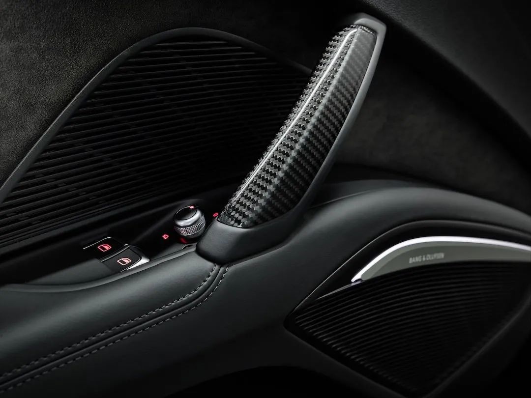 细节之处,比如,门板处以及方向盘则用Alcantara材质进行覆盖包裹,扶手处则用上了碳纤维材质,为车厢内部营造出不俗的运动氛围。