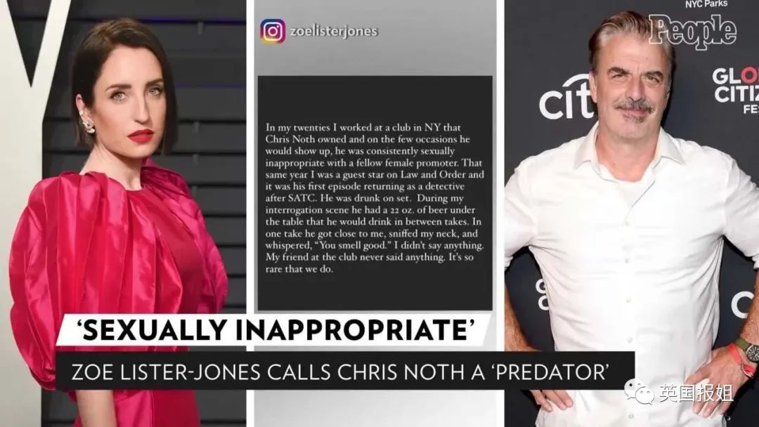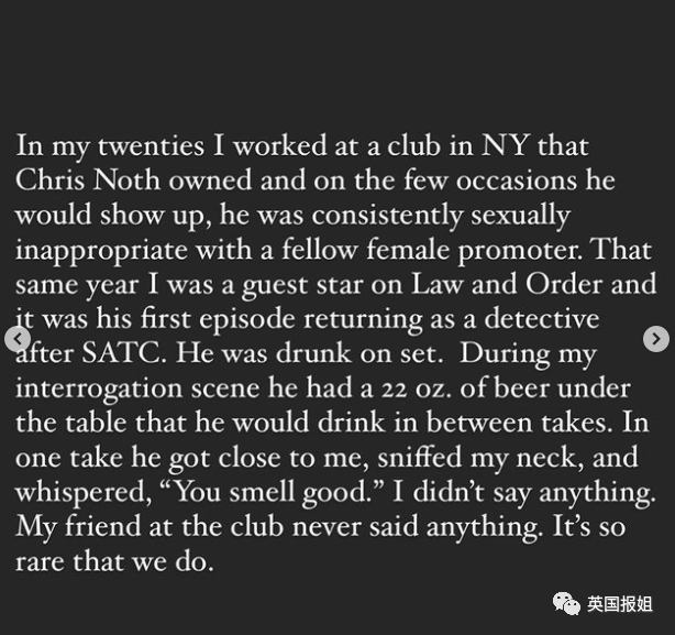 “我20多岁时,曾在克里斯名下的一家纽约夜店工作,他有时会出现,一直对另一位女性职员有不当性行为。那年我刚好客串过《法律与秩序》,也正好是他拍完《欲望都市》后回归的第一集。他喝得烂醉,和我演审问戏的时候桌子下放着650毫升的啤酒,拍摄间隙喝,还悄悄对我说‘你真好闻’。我那时什么都没说,夜店的人也什么都没说,我们几乎从不说。”