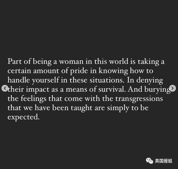 “我说你结婚了有孩子,他立刻回答‘婚姻是个骗局,一夫一妻制根本不存在’,然后继续。我当时差不多是哭着被强奸的,结束后,我去浴室整理了自己,这么多年对这个明星的所有幻想都幻灭了。”