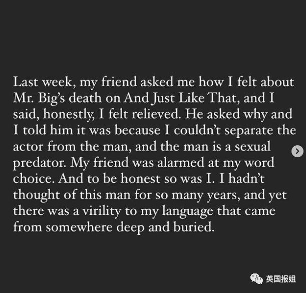 “上周,朋友问我对大先生的死和《就这样…》的感觉。我说‘说实话,我觉得解脱。’他问为什么,我说因为我没法把演员和角色分开,那个男人是个性狩猎者。我朋友对我的言辞感到惊讶,说实话,我自己也是。我很多年没想过这个人了,但我内心深处埋藏着一股气。”