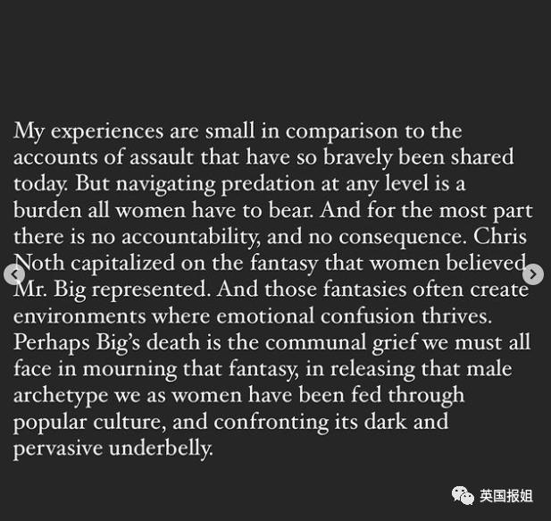 “我的经历,和那些勇敢分享自己被骚扰经历的女性相比微不足道,但在这万劫不复中的任何阶段穿行,是所有女人都要承受的问题。更多时候,无人认罪,没有后果。克里斯靠着女人们对大先生Mr.Big的幻想获利,这些幻想营造的环境,经常会给人带来情感上的困惑。或许大先生的死,就是我们为这种幻想的集体默哀,让我们看到流行文化喂给我们的男性原型,直面他黑暗和习以为常的丑态。”